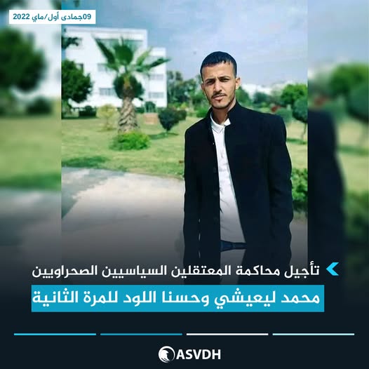 أرجأت المحكمة الابتدائية بآكدير/المغرب وللمرة الثانية على التوالي النظر في قضية المعتقلين السياسيين الصحراويين الطالبين محمد ليعيشي وحسنا اللود الى غاية 2022.05.16 .
