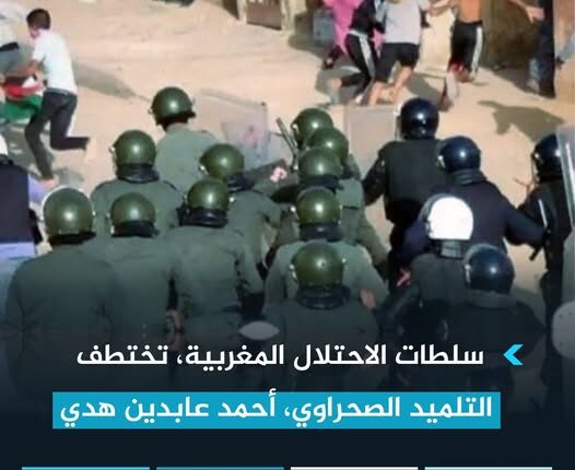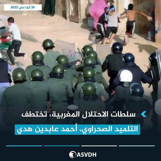 اقدمت عناصر تابعة لسلطات الإحتلال المغربي، عصر يوم الأمس، الأحد 30 مايو 2022 ، على إختطاف التلميد الصحراوي، أحمد عابدين هدي، أخ الأسير المدني الصحراوي عضو مجموعة أكديم ازيك محمد لمين عابدين هدي، بعد لحظات قليلة من خروجه من منزل عائلته بمدينة العيون المحتلة.