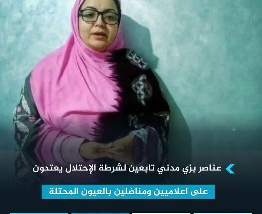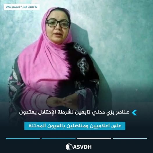 بعد أن خرج المستوطنون المغاربة، مساء يوم أمس الخميس 01/12/2022 في مسيرات إستفزازية، لمشاعر أبناء الشعب الصحراوي، في أزقة وشوارع مدينة العيون المحتلة، بتنظيم وتوجيه من سلطات الإحتلال المغربي، وتحت حمايتها، أقدم عناصر بزي مدني تابعين لشرطة الإحتلال، على إعتراض سيارة الإعلامية الصحراوية، عضو مجموعة التلفزيون الوطني الصحراوي، الصالحة بوتنكيزة، والتي كانت برفقتها الناشطة الصحراوية مريم دمبر، حيث تم إنزالهما بالقوة من السيارة والإعتداء عليهما.