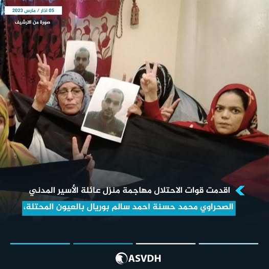 أقدمت مجموعة من عناصر شرطة الإحتلال المغربي يتقدمها الجلاد يونس فاضل الملقب ب (ولد التوجيمة) ، على الساعة 20:50 من مساء اليوم السبت 04 مارس 2023 ، على مهاجمة منزل عائلة الأسير المدني الصحراوي مومحمد حسنة احمد سالم بوريال بالعيون المحتلة، حيث كانت مجموعة من المناضلات الصحراويات ينظمن لقاءا تواصليا سلميا تخليدا لليوم العالمي للمرأة الذي تحييه كل شعوب الأرض في الثامن من شهر مارس من كل سنة، وكذا لإحياء ذكرى إستشهاد البشير لحلاوي أول شهيد صحراوي بالإضافة الى تهنئة الأسير المدني الصحراوي يحيى محمد الحافظ إعزة الذي أفرج عنه بتاريخ 01 مارس 2023 ، بعد أن قضى 15 سنة بسجون الإحتلال المغربي.