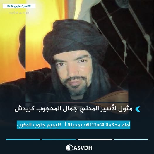 مثل يوم أمس الخميس 09 مارس 2023، المناضل الإعلامي والحقوقي الصحراوي، رئيس المرصد الصحراوي لتوثيق انتهاكات حقوق الإنسان بالصحراء الغربية، الأسير المدني جمال المحجوب كريدش، أمام محكمة الاستئناف بمدينة أگليميم/جنوب المغرب، وقد تم تأجيل الجلسة للمرة الثانية إلى يوم 23 مارس الجاري.