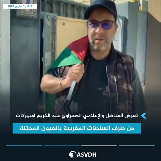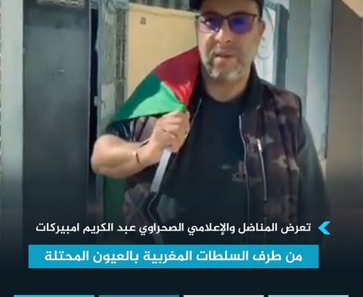 منذ فترة طويلة، يتعرض المناضل والإعلامي الصحراوي عبد الكريم امبيركات للتضييق والإستفزاز والتمييز والحصار، من طرف السلطات المغربية بالعيون المحتلة، ولم يتوقف الأمر عند هذا الحد، بل تم قطع راتبه الشهري في إطار سياسة الخنق المالي ، وتشديد مراقبة منزله وتهديده بالتصفية الجسدية، كما تتعرض عائلته للاعتداء.