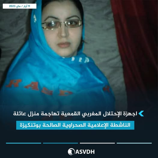 أقدمت يوم أمس الاربعاء 10 ماي 2023، اجهزة الإحتلال المغربي القمعية، على مهاجمة منزل عائلة الناشطة الإعلامية الصحراوية الصالحة بوتنكيزة بالعيون المحتلة،حيث تم تعنيف كل من الإعلامية الصالحة محمد البشير بوتنگيزة والمعتقلة السياسية السابقة محفوظة بمبا لفقير والاعتداء عليهما.