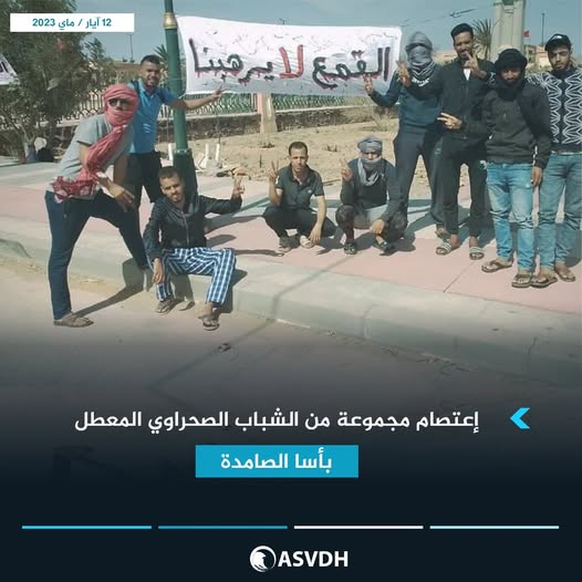 لازال مجموعة من الشباب الصحراوي المعطل بأسا الصامدة، يواصلون إعتصامهم المفتوح أمام ما يسمى بعمالة اسا الزاك، منذ يوم الثلاثاء 09 ماي 2023، وهو الاعتصام الذي سبق واشارت الجمعية الصحراوية ASVDH في بلاغ سابق ، أنه ياتي للتنديد بالفساد والظلم و سياسات التفقير والتجويع والإستهتار والتهميش التي يمارسها النظام المغربي في حق الجماهير الصحراوية المقهورة وطاقاتها الشابة المحرومة، من الحق في الصحة والتعليم والشغل ومن كل الحقوق المدنية والسياسية والإجتماعية والثقافية، وذلك إستنادا لبيان الشباب المعتصم.