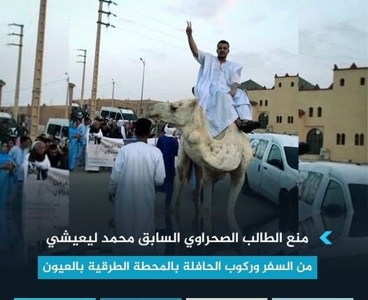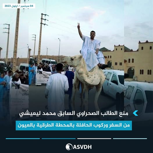 في إطار سياسة الترهيب والإنتقام التي تمارسها أجهزة الإحتلال المغربي القمعية في حق النشطاء الصحراويين، أقدم ما يسمى بقائد الملحقة الإدارية الأولى مساء امس الأحد 03 سبتمبر 2023 وبشكل تعسفي على منع الطالب الصحراوي والمعتقل السياسي السابق المفرج عنه مؤخرا محمد ليعيشي من السفر وركوب الحافلة بالمحطة الطرقية بالعيون المحتلة، في خرق سافر وارعن من طرف هذا الجلاد المعروف بحقده على النشطاء السياسيين والحقوقيين الصحراويين.