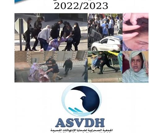 الجمعية الصحراوية ASVDH تصدر تقريرها السنوي، الذي يتضمن حصيلة رصد جانب مهم من الخروقات السافرة للقانون الدولي الإنساني والقانون الدولي لحقوق الإنسان، خلال الفترة الممتدة من 01 اكتوبر 2022 إلى 30 شتنبر 2023.