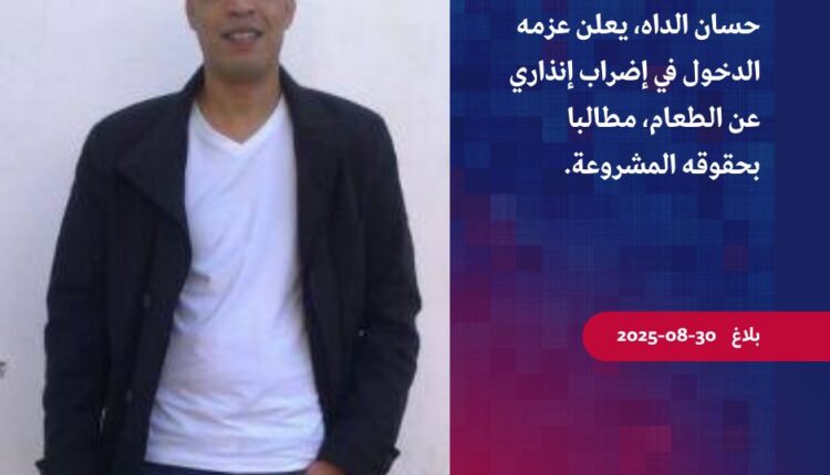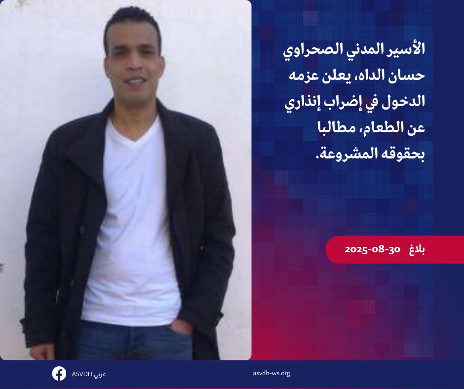 أفادت عائلة الأسير المدني الصحراوي حسان الداه، عضو الجمعية الصحراوية ASVDH، بأنه يعتزم خوض إضراب إنذاري عن الطعام لمدة 48 ساعة، وذلك ابتداءً من يوم الثلاثاء 2 سبتمبر 2025، احتجاجًا على استمرار الانتهاكات الممنهجة التي تطاله داخل سجن القنيطرة المغربي، ومطالبته بتوفير أبسط حقوقه المشروعة كأسير صحراوي، وتأتي هذه الخطوة للمطالبة بما يلي: