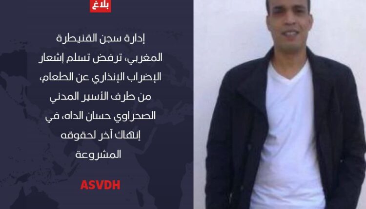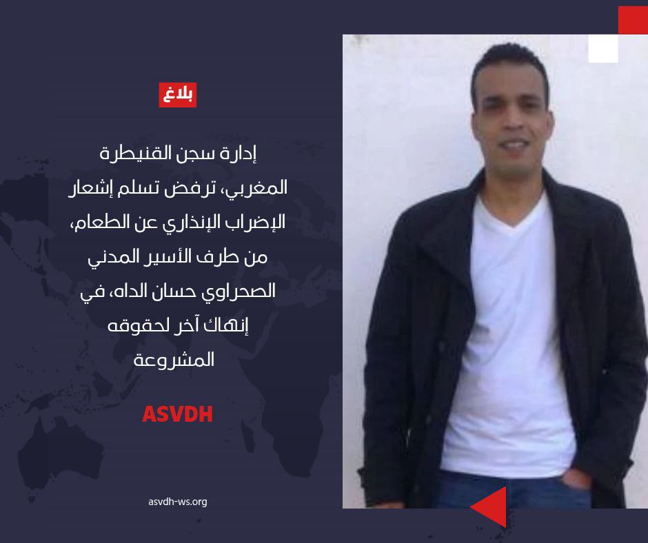 إدارة سجن القنيطرة المغربي ترفض تسلم إشعار الإضراب الإنذاري عن الطعام من الأسير المدني الصحراوي، وعضو ASVDH حسان الداه.