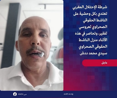 وقد تم الاعتداء الجسدي على الناشط لعروسي أثناء توجهه إلى منزل رئيس اللجنة الصحراوية (كودابسو) ، السيد سيدي محمد ددش، حيث تم تمزيق نعاله وتحطيم نظاراته الطبية، في اعتداء سافر يعكس مستوى الترهيب والقمع الذي تمارسه أجهزة الاحتلال المغربي ضد النشطاء الحقوقيين الصحراويين.