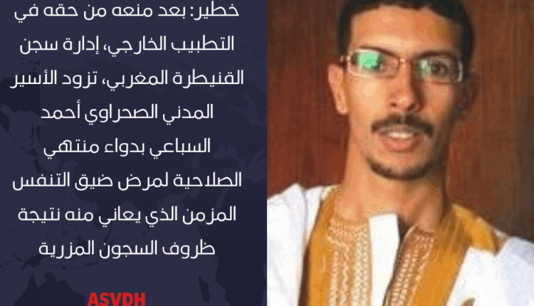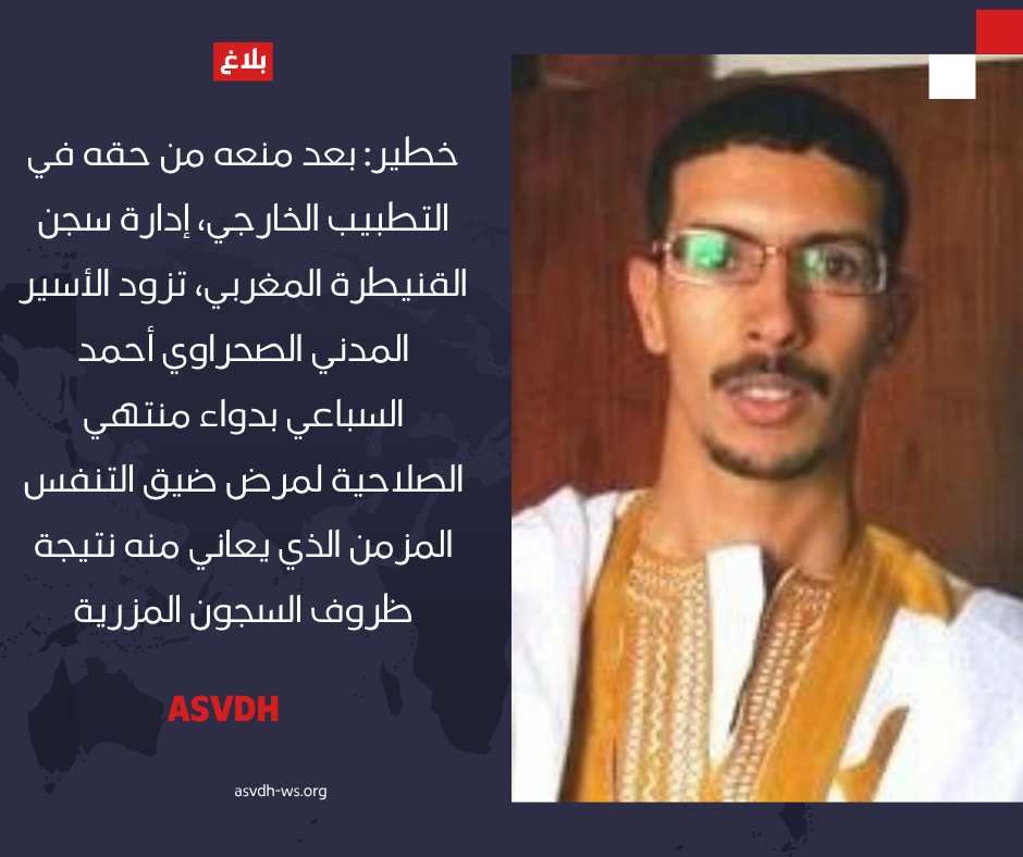 تتابع الجمعية الصحراوية ASVDH بقلق بالغ الوضع الصحي المتدهور للأسير المدني الصحراوي أحمد السباعي، عضو الجمعية والمعتقل ضمن مجموعة أكديم إزيك، والمحكوم عليه بالسجن المؤبد بسجن القنيطرة، نتيجة سياسة الإهمال الطبي الممنهج والتلاعب الخطير بصحته التي تمارسها إدارة السجن المذكور في حقه.